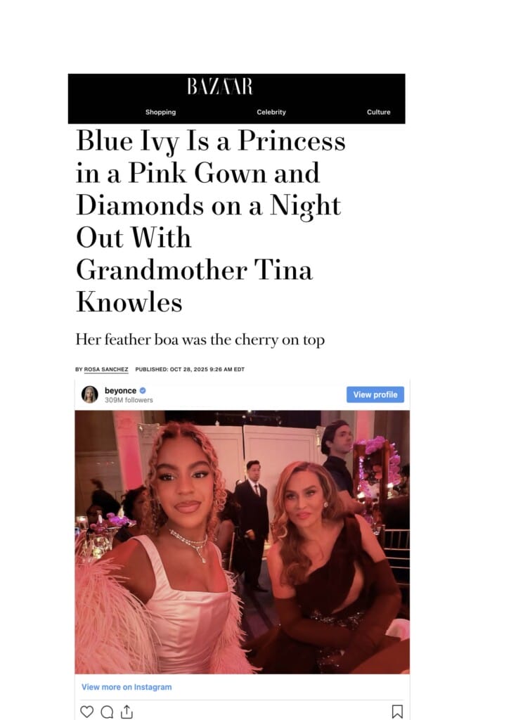 Blue Ivy Is a Princess in a Pink Gown and Diamonds on a Night Out With Grandmother Tina Knowles View the article Published : October 28, 2025 Back to : Press
