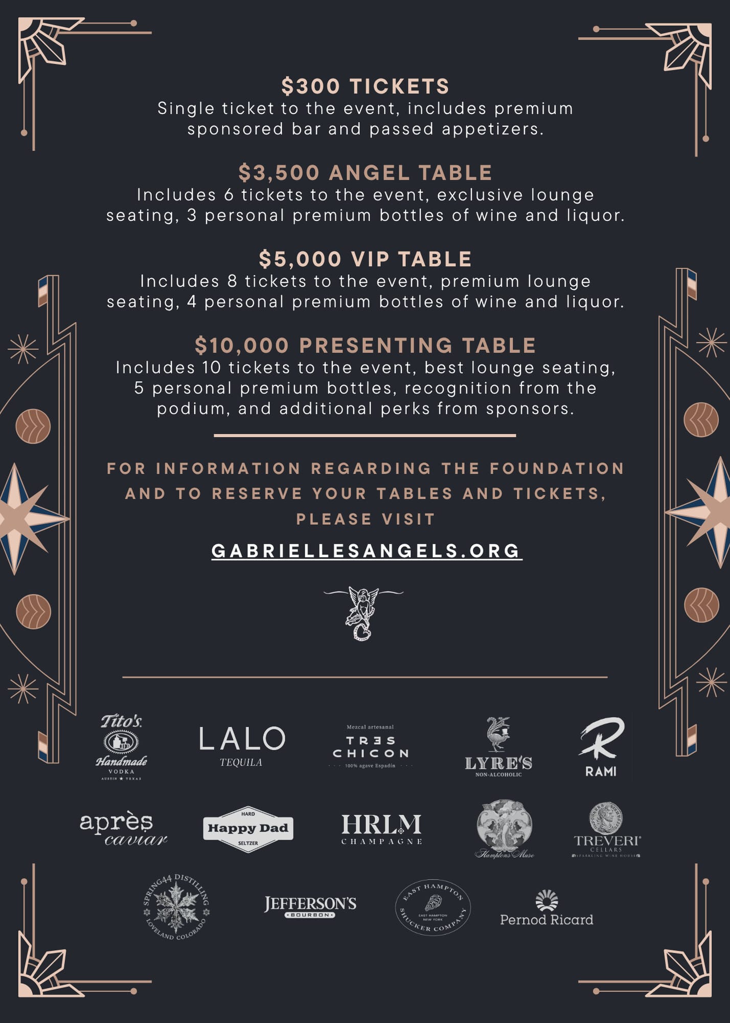- Two tables for 10 at the Gala (lounge seating with 5 premium bottle bottles of wine and liquor plus additional perks from sponsors)