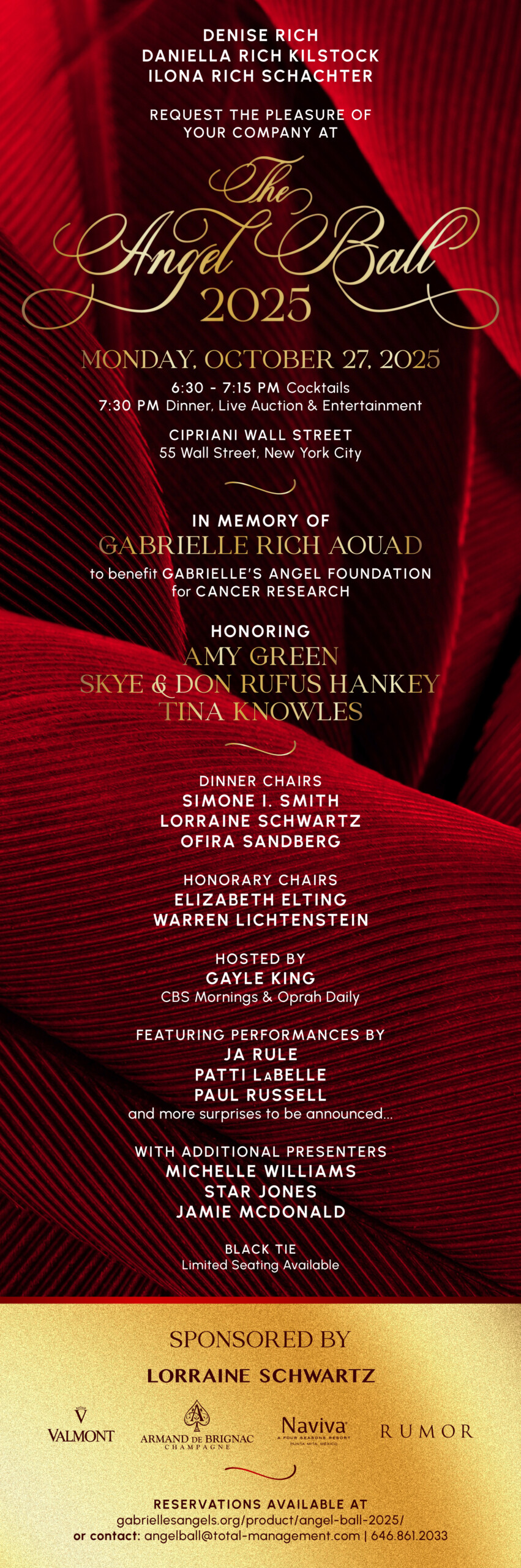 | Tables & Tickets | $2,000 Cherub Ticket, $3,000 Earth Angel Ticket, $15,000 Pair of Angel Wing Tickets, $20,000 Heavenly Angel Table for 10, $30,000 Guardian Angel Table for 10, $50,000 Archangel Table for 10, $100,000 Gabrielle’s Angel Table for 12 |